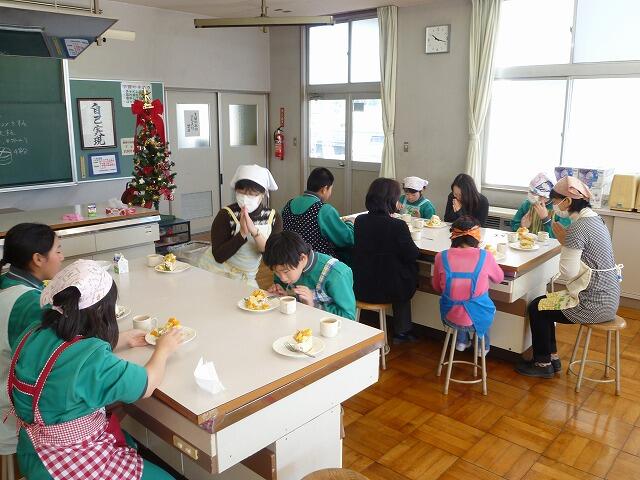 みんなで飾り付けをしたクリスマスツリーが飾られた家庭科室で