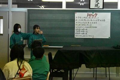 まずはじめに、皆川中学校開校当時から今年度の生徒の様子までをスライドで振り返りました。昭和22年開校当時のモノクロ写真から、だんだんと現在に近づいていきます。時代は違えども、皆川中で学ぶ生徒の表情が明るく生き生きと輝いています。スライドと共に、79年という年月を辿っていきました。