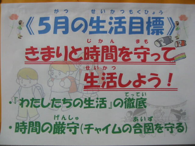一覧へ 5月の生活目標 投稿日時: 2014/05/19 皆川城東小管理者 5月の生活目標は、「きまりと時間を守って生活しよう!」です。 新しい学年になって約2ヶ月、子どもたちは、新しい生活にも慣れ、今月末にある運動会に向けて、一生懸命練習に励んでいます。