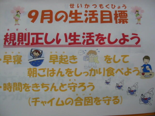 一覧へ 9月の生活目標 投稿日時: 2014/09/01 皆川城東小管理者 9月の生活目標は、「規則正しい生活をしよう」です。 楽しかった夏休みが終わり、2学期が始まりました。 生活リズムを学校モードに切り替えて、勉強・運動に頑張りましょう。