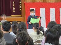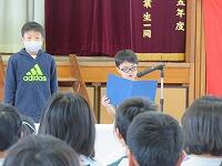 1年間のまとめとして、修了式を行いました。まず、各学年の代表児童に修了証を授与し、1・4年生の代表児童の作文発表がありました。次に、校長講話で、学習・運動・生活について1年間・3学期を振り返り、各自の成長を確かめ合いました。最後に、児童指導主任から、春休みの過ごし方についての話がありました。