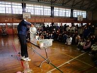 今日は第2学期終業式でした。2校時の終業式では、児童代表で3年生と5年生が発表しました。2学期を振り返って、楽しかったことや頑張ったことを、はっきりとした声でみんなに伝わるように発表していました。立派な態度でした。学校長の話では、液体窒素を使ったサイエンスショーを行いました。液体窒素に入れると生花は粉々に割れてしまいますが、造花は変わりません。バナナで釘も打てました。フィルムケースのロケットがパンっと空を舞うと「わあっ」と子どもたちから歓声が上がりました。その他、二酸化炭素や風船をつかった実験もあり、子どもたちは興味をもって見ることができました。最後に学校長から、自分の興味のあること、おもしろいと思うことに挑戦しましょうと話がありました。