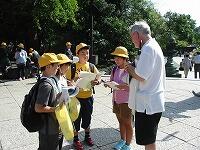 緑地公園での出発式の後、保護者の方の見送りで元気に出発しました。