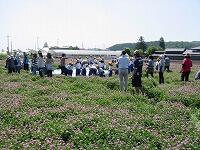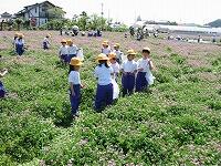 1・2年生合同の生活科の学習で、大皆川の関口さんのれんげ畑に行きました。