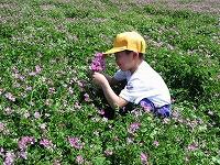 アシストネットボランティアのみなさんと一緒に、畑いっぱいに広がったれんげの花で、花摘みをしたり、輪飾りを作ったり、、、
