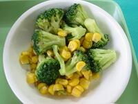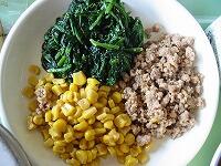 三色は、鶏肉の甘辛、ほうれん草のお浸し、コーンです。