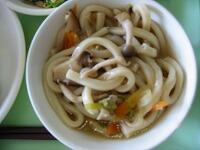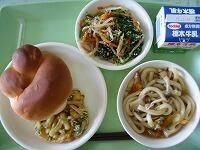 今日の献立は、ミルクパン、きのこうどん、かき揚げ、ほうれんそうとごまのしょうゆあえ