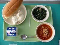 今日の献立は、フルーツクリームサンド、ほうれん草のソテー、ポークビーンズ です。