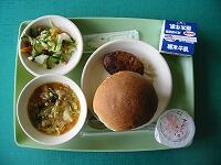 今日の献立は、ハンバーガー(丸パン)、フレンチサラダ、洋風たまごスープ