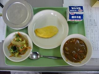 今日の献立は、ポークカレーライス(麦入りご飯)、ツナマヨオムレツ