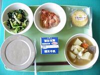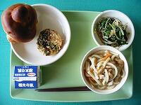 今日は、アップルパン、うどん、菜の花のかき揚げ、野菜のごましょうゆ和え です。