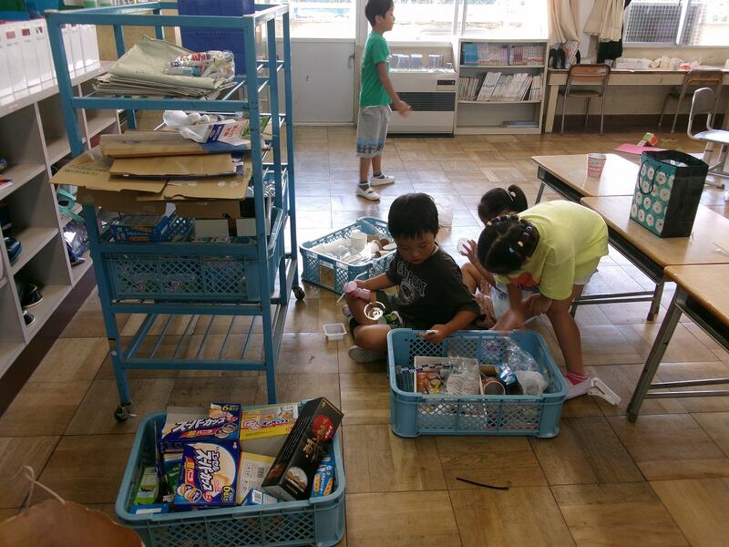 みんなで家から持ち寄った材料がいっぱい! 図工でも使えるようにストックして使っています。