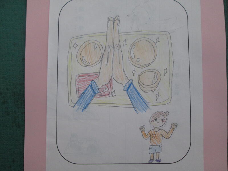 ② 階段の踊り場や教室に、給食に関する標語や絵の作品を掲示しています。作品を通して、給食に関わってくださる方々や、食べ物の命に対して感謝の気持ちを育むことができました。