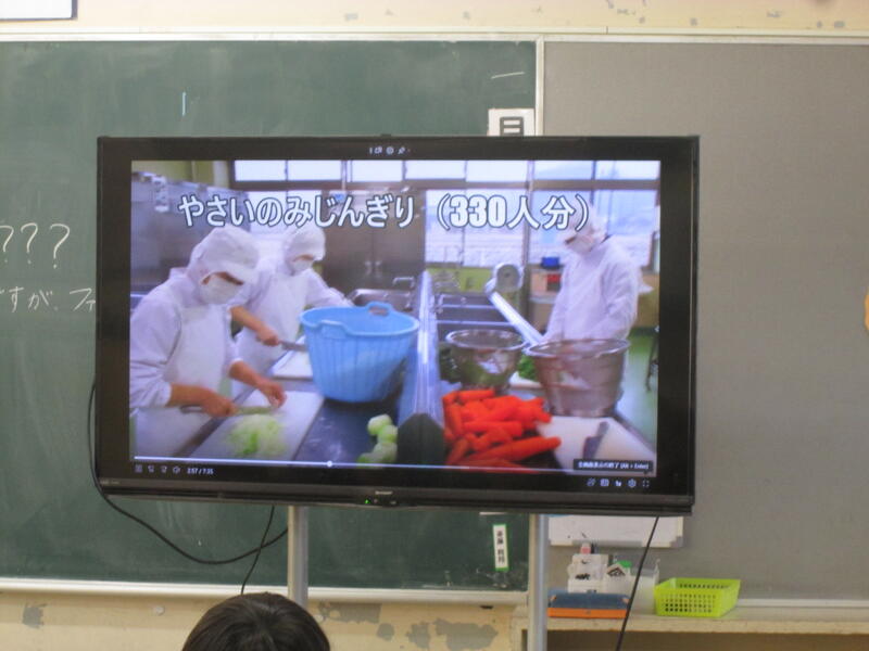 ① 栄養教諭が調理場の様子や給食ができるまでの調理過程を撮影した動画を、各学年で視聴しました。献立を考える栄養教諭、朝早くから作る調理員さん、運んでくれるドライバーさん、食材を育てる農家さんなど、多くの人たちのおかげで、安全・安心でおいしい給食が毎日食べられることが分かりました。