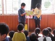 今日は、お昼休みに図書委員が、「読み聞かせ」と「クイズかるた」をやってくれました。