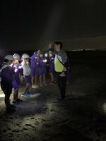 夕食はハムカツ、唐揚げ、水餃子、ポテトサラダ、ご飯、味噌汁、ゼリーでした。たくさん食べて、ナイトハイキングで浜辺に来ています。風が気持ちよく、夜は波の音がより大きく聞こえています。子供たちは、貝がらやカニを見つけて大喜びです!
