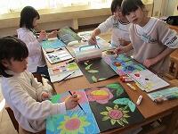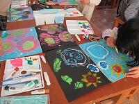 今日は、印刷を行いました。彫っていない部分に絵の具で色を塗り、黒い紙に印刷していきます。絵の具の濃さやちょっと白色を混ぜて色を作ると黒い紙によく映えます。どんな作品に仕上がるのか、楽しみです。