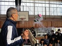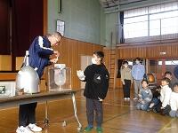 今日は第2学期終業式でした。2校時の終業式では、児童代表で3年生と5年生が発表しました。2学期を振り返って、楽しかったことや頑張ったことを、はっきりとした声でみんなに伝わるように発表していました。立派な態度でした。学校長の話では、液体窒素を使ったサイエンスショーを行いました。液体窒素に入れると生花は粉々に割れてしまいますが、造花は変わりません。バナナで釘も打てました。フィルムケースのロケットがパンっと空を舞うと「わあっ」と子どもたちから歓声が上がりました。その他、二酸化炭素や風船をつかった実験もあり、子どもたちは興味をもって見ることができました。最後に学校長から、自分の興味のあること、おもしろいと思うことに挑戦しましょうと話がありました。