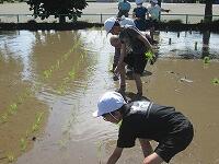 5年生が、「田植え体験」をしました。地域の方のご厚意で毎年実施しています。学校そばの土地が数日の間に、水の入った田んぼに変わっていました。指導の地域の方の説明を聞いたり、植え方のお手本を見たりして、5年生も挑戦しました。田植え機の運転にも挑戦させて頂きました。田んぼの土の感触を感じながら、楽しく活動することができました。地域の方のお陰で貴重な体験をさせて頂きました。この後の苗の生長が楽しみです。