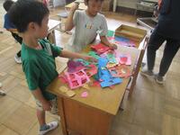 本日の図工の時間には、前回の図工で制作した、紙を折って切った飾りを教室に飾り付けました。