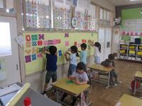 貼り付け方にはあえて指定を設けず始めてみると、最初の頃は横に規則正しく並べて貼り付け始めました。その後、だんだんと自由に貼るようになりました。貼り終わると、教室が今まで以上に自分たちのものに感じられるようになり、満足げな子どもたちでした。