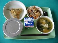 今日は、五目ご飯、アジフライ、小松菜と豆腐のみそ汁 です。