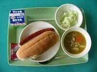 今日は、ハンバーガー、じゃがいものチーズ煮、とうもろこしのスープです。