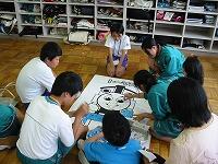 風船バレーボールの様子です。みんな上手 貼り絵を三校で協力して作っています。