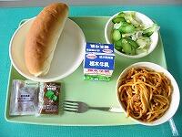 コッペパン、とちおとめジャム、スパゲティミートソース、姫キュウリとキャベツのサラダ