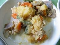 今日は、セルフチキンライス、フライドポテト、野菜スープです。