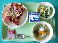 今日は、ピザトースト、ごまドレサラダ、エビ団子スープです。