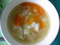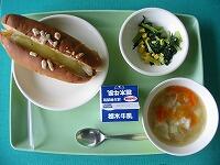 今日の献立は、ピザドック、小松菜とコーンのソテー、キャベツのスープです。