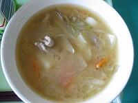 今日の献立は、ごはん、キャベツと豚肉の味噌いため、スーミータン、杏仁豆腐