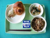 今日の献立は、ミルクパン、焼きそば、とり肉のハーブ焼き、大根サラダ です。