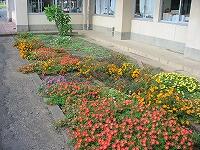 風に校旗がはためいています。 花壇の花がとてもきれいです。