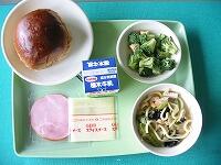 今日の献立は、黒パン、ハム・チーズ、長崎ちゃんぽん、ブロッコリーのサラダ