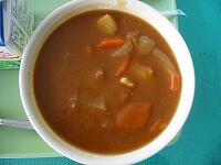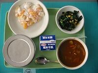 今日の献立は、ごはん、チキンカレー、ホウレンソウのソテー、フルーツヨーグルトです。