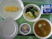今日の献立は、 ごはん、あつやき玉子、からしあえ、いなか汁、納豆 です。
