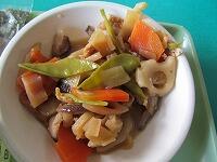 今日の献立は、赤飯、鶏肉の七味焼き、五目きんぴら、ゆば玉汁、