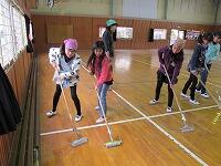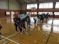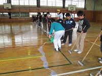5年生が卒業式のために体育館を水拭きし、ワックスを丁寧