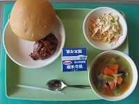 今日の給食は、バーガーパン、ハンバーグトマトソース、コールスローサラダ、