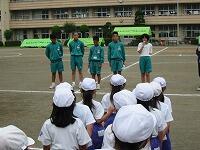 朝の全校練習の始まる前に、全児童の前であいさつをしてもらいました。