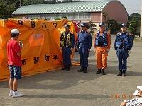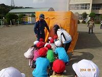 校庭では、消防署の方にお話を伺った後、全校生が煙体験ハウスに入って煙体験をしました。実際の火災現場では、煙で視界が悪く、息苦しくなることを疑似体験しました。