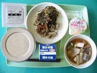 今日の献立は、ごはん、麦入り納豆、豚肉と昆布のしょうが炒め