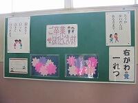 図書室前の掲示物、花が、在校生の贈る言葉に