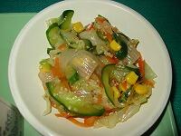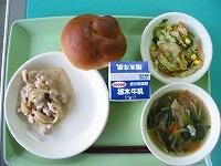 今日の献立は、ミルクパン、鶏肉のマヨネーズ炒め、こんにゃくサラダ、春雨スープです。