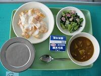 今日の献立は、麦ごはん、ポークカレー、しめじと小松菜のソテー、フルーツヨーグルト和えです。