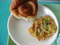 今日の献立は、米粉パン、煮込みうどん、野菜のかき揚げ、ごま和えです。