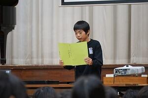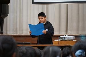 久しぶりに会う子どもたちは、みんな元気そうでした。はじめに、国歌斉唱をし、児童代表作文発表です。1年生と6年生の代表児童が、3学期に頑張りたいことを発表しました。