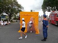 南小では年に5回避難訓練を実施しています。そのうち1回を総合避難訓練として学校行事1時間とり本格的な訓練をしています。防火シャッターを閉めて横の扉を使い避難する体験をしました。今年度は栃木市消防署の方々を招聘し、はしご車体験、消火体験を代表児童が行いました。また煙体験を全児童が行いました。児童たちは、このような体験をとおして防火意識を高めていきました。